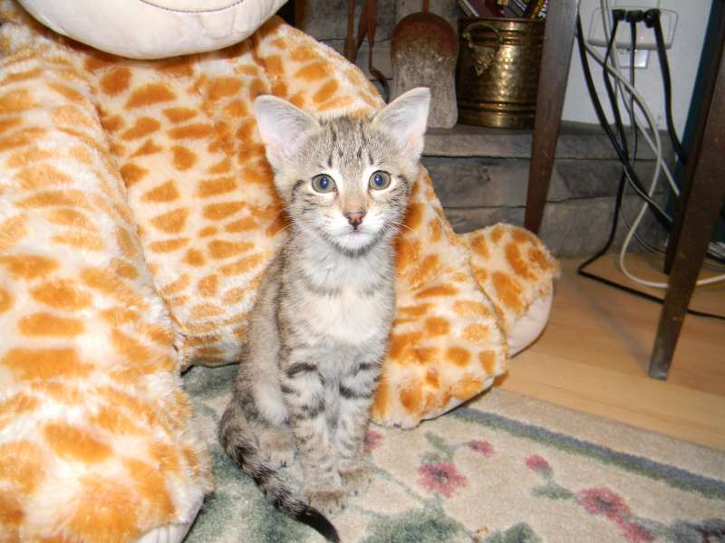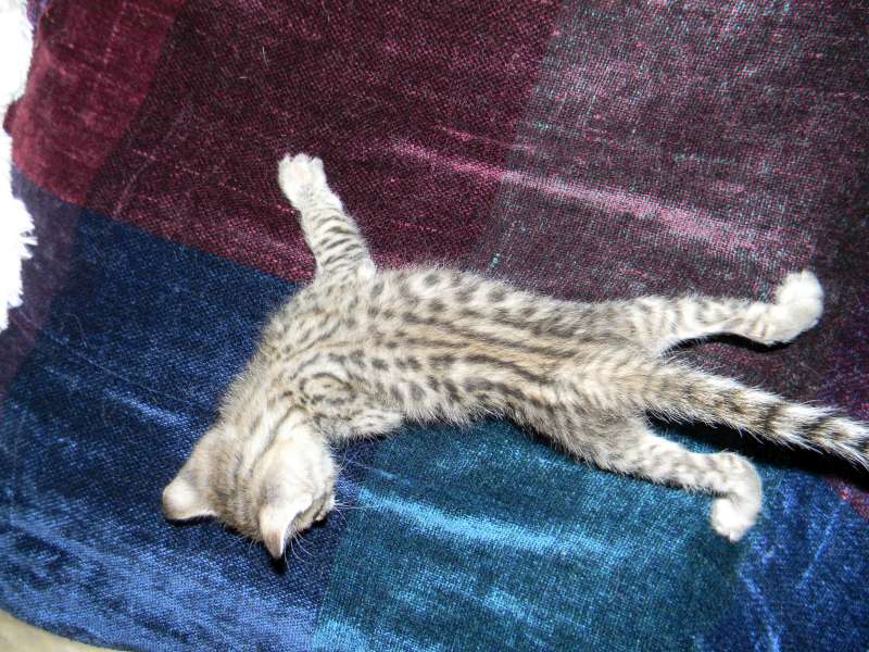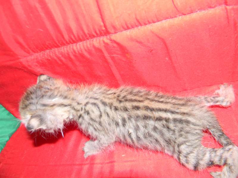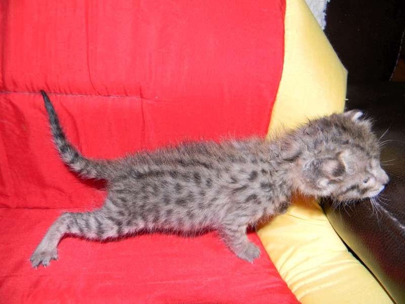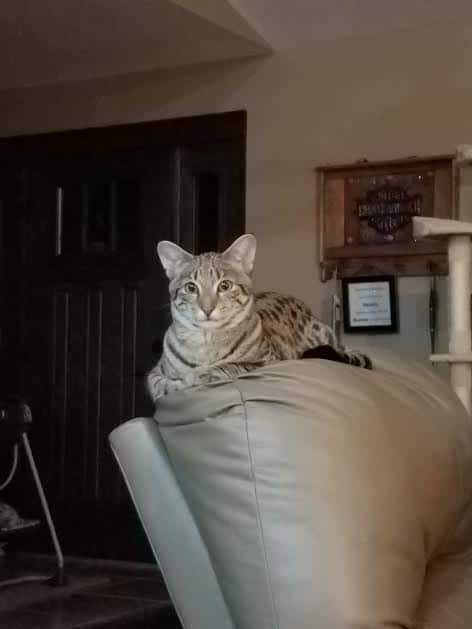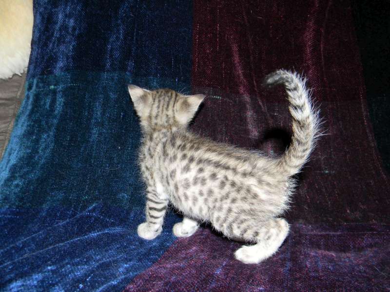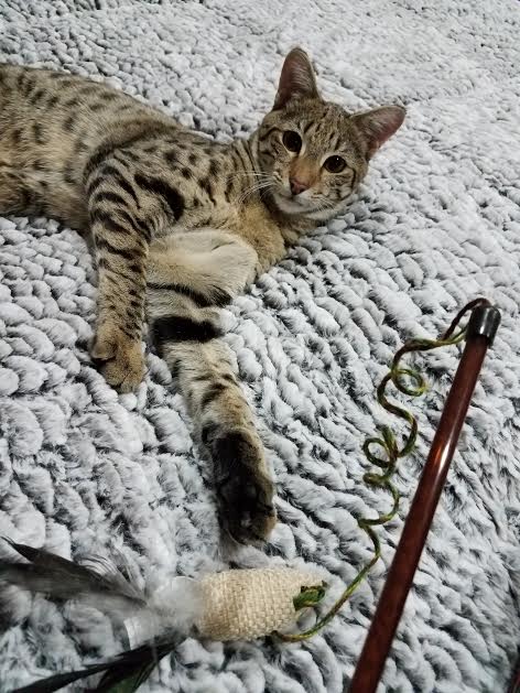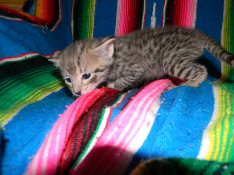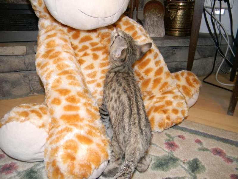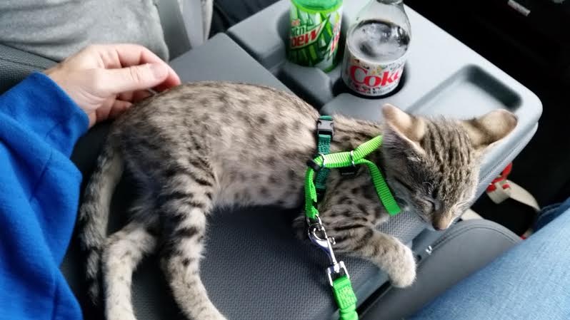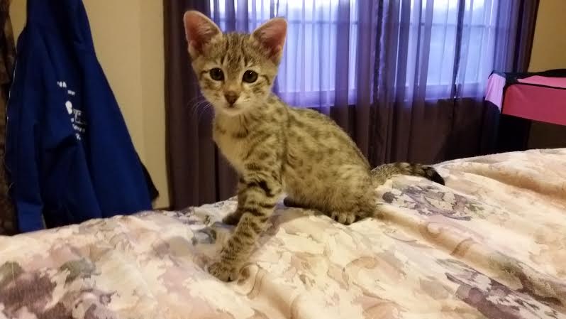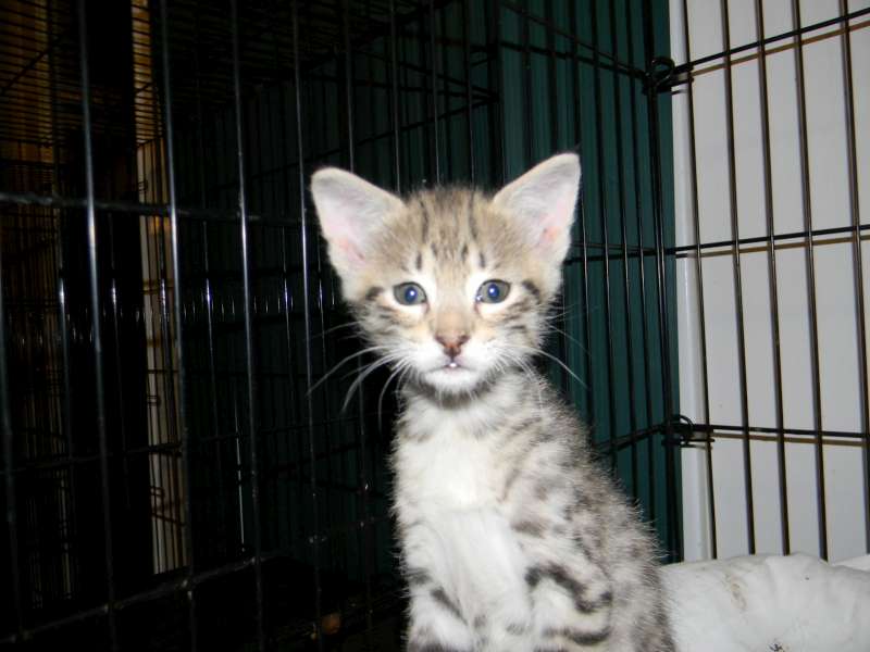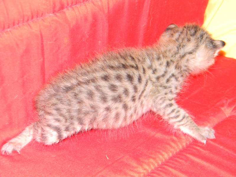 Savannah F-2B female Brown Spotted DOB 1-2-16This Beautiful Girl has great Ocelli, a near back nose and super sweet personality. A 100 % Human Imprint she will make a fabulous family pet and companion for Shelly and Jeff in IL. [Show slideshow]1 2 ►