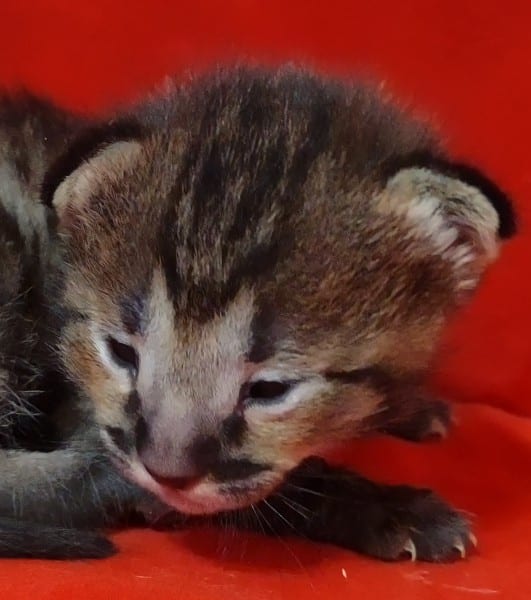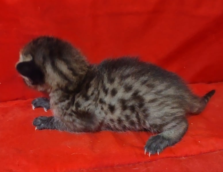 Savannah F-3C Male #2 DOB 10-21-23Fabulous spots from a wonderful pairing this F-3C warm brown spotted boy will grow to be a very exotic but loving pet for Thomas in NC. [Show slideshow]