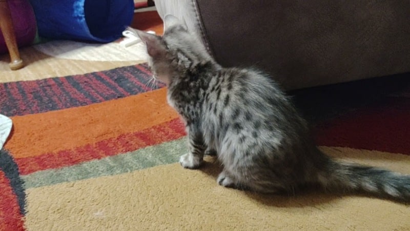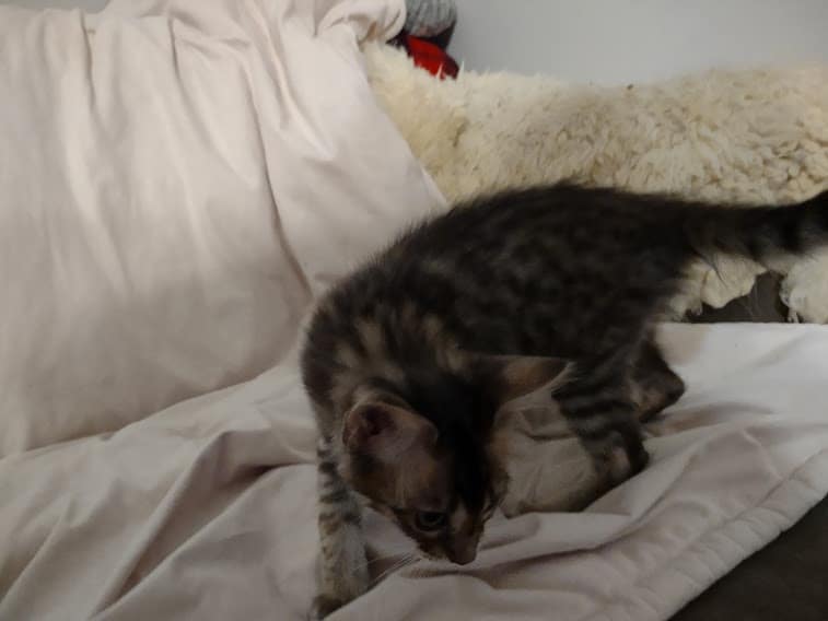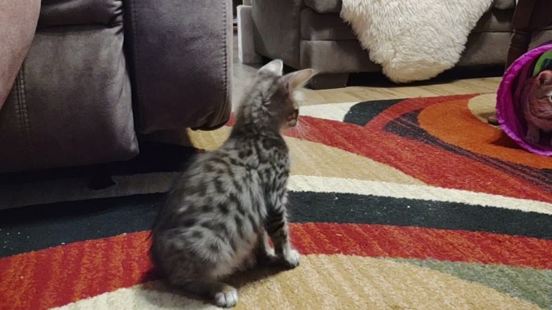 Just too sweet and great spots will make this kitten an exotic looking but still loving pet and companion She's a little on the fluffy side for a Savannah but everyone loves a fuzzy baby. She will be going home to Kyle in MA.