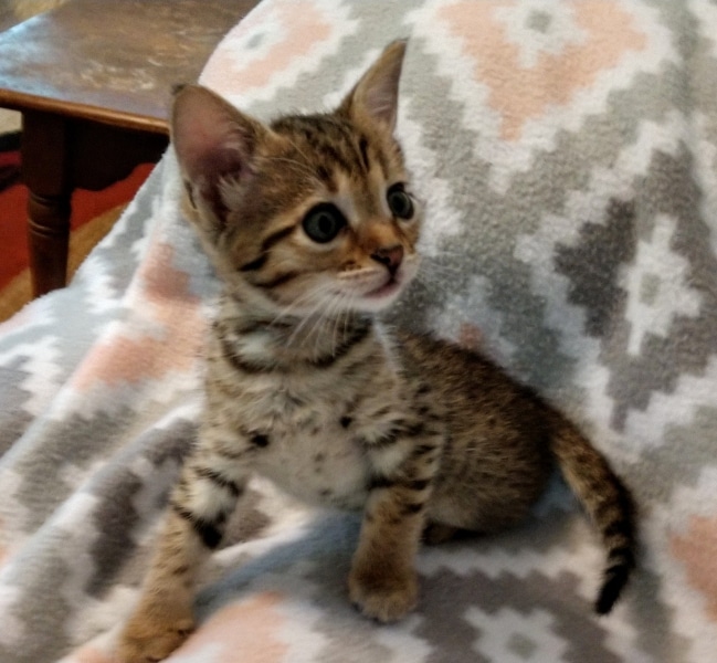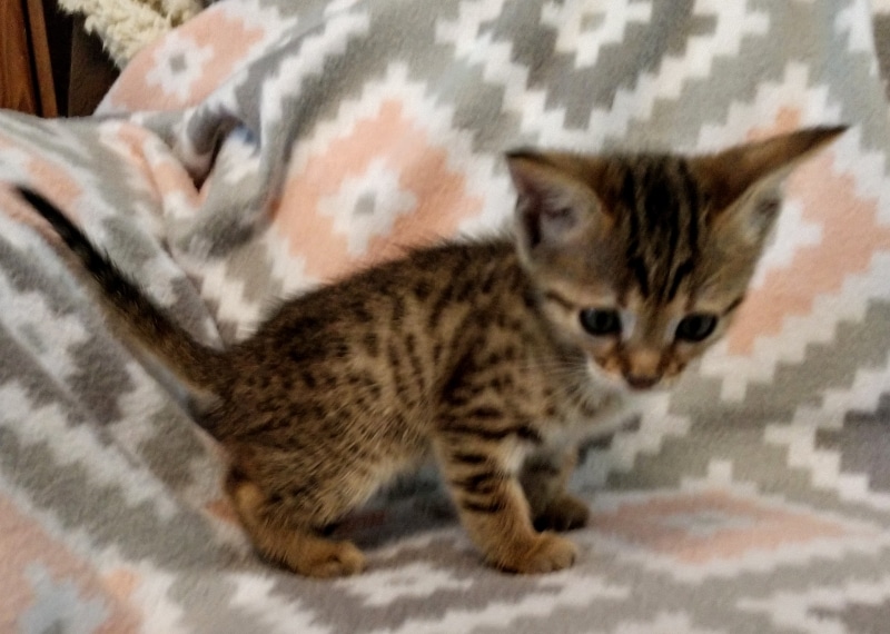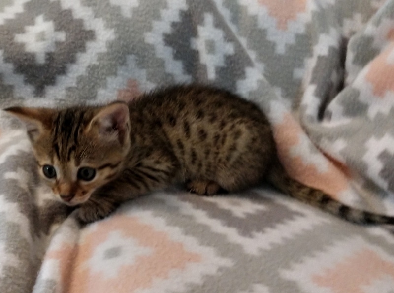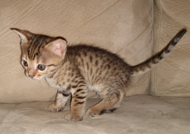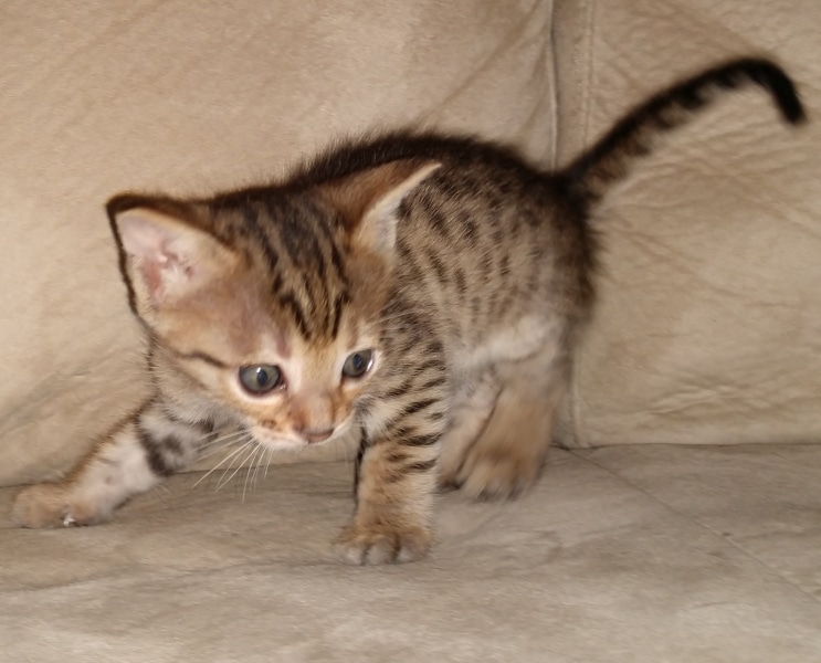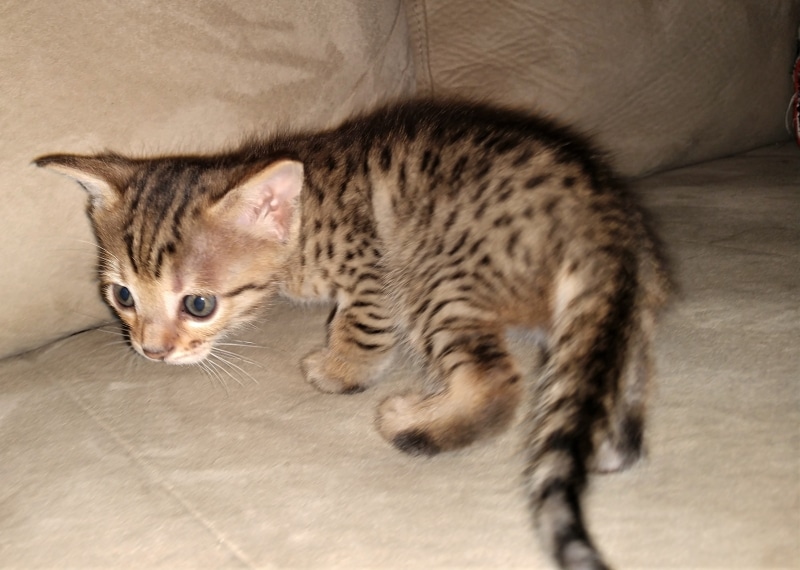 Savannah F-4SBT BST Male DOB 6-5-20This beautiful baby boy is a singleton so he has his mother Solara's undivided attention. He has great spots and as an F-4SBT is eligible for show and is considered a true purebred. He will be going home to Luis in VA. [Show slideshow]