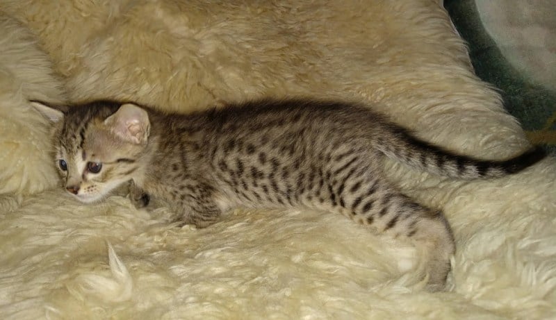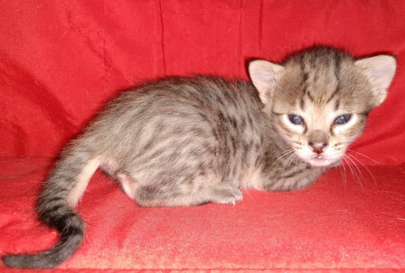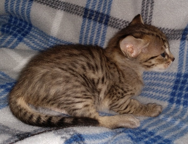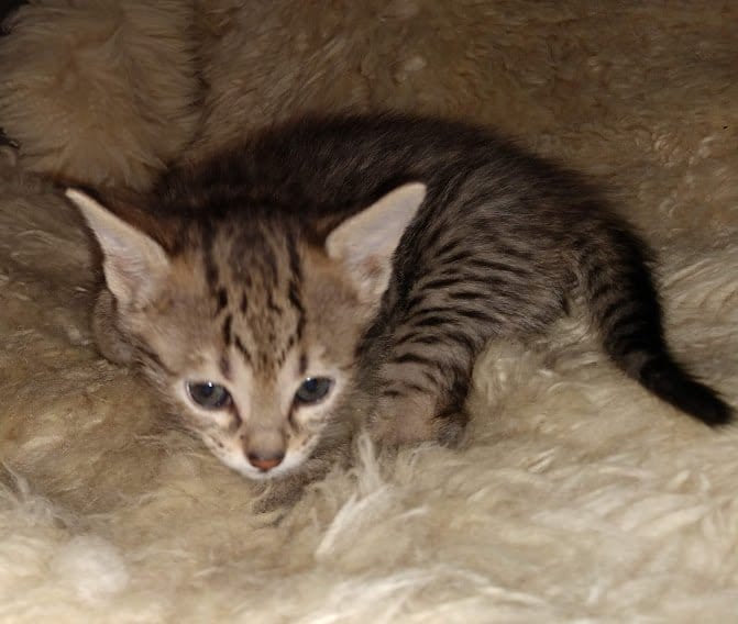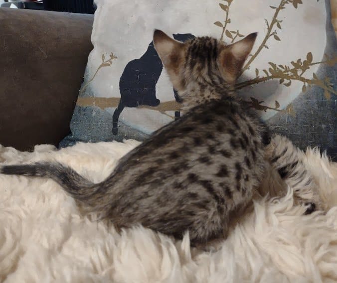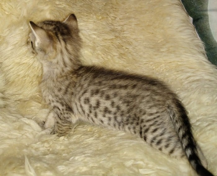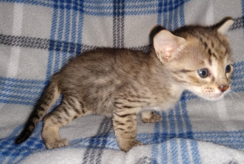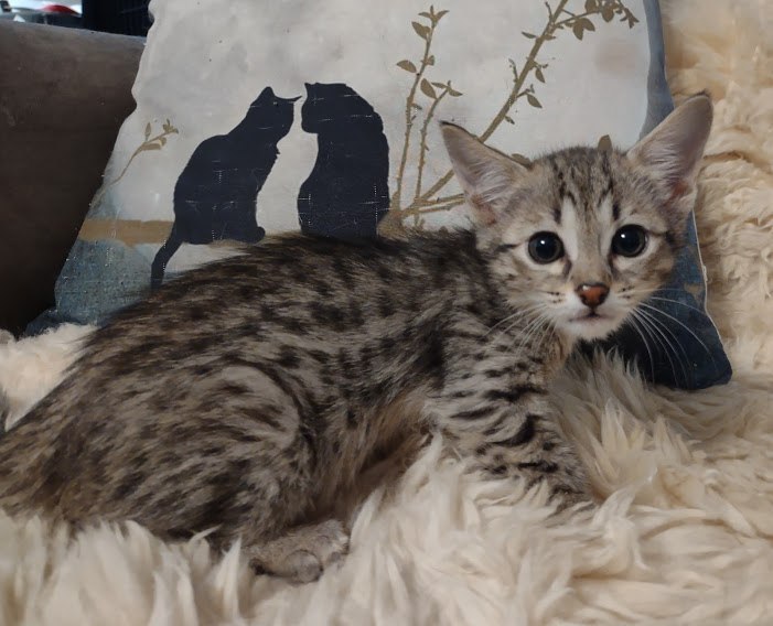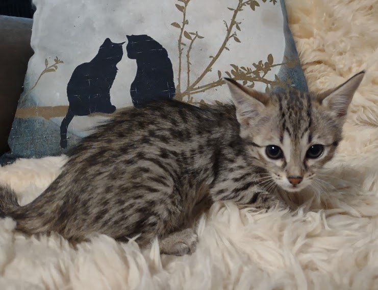 Savannah F-4SBT Female Cool BST DOB 4-11-21This beautiful F-4SBT savannah girl will make someone and exceptional pet and Best Buddy. She get better every time I take new pics. She will be stunning and is going home with her sister/littermate Cinnamon to Sam in KY. [Show slideshow]1 2 ►