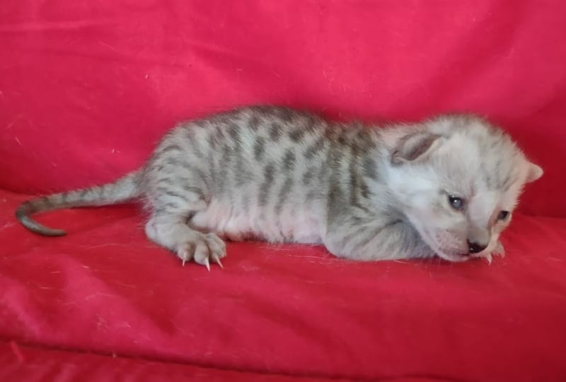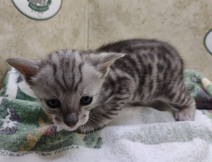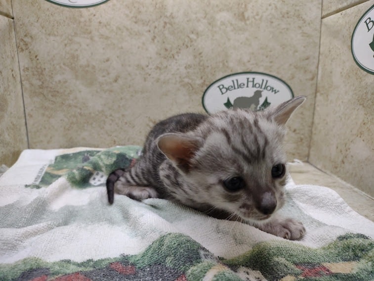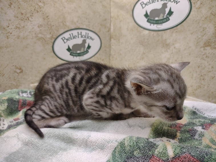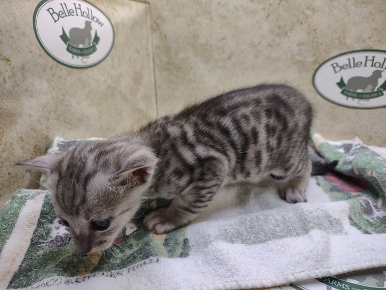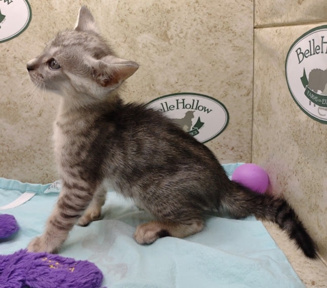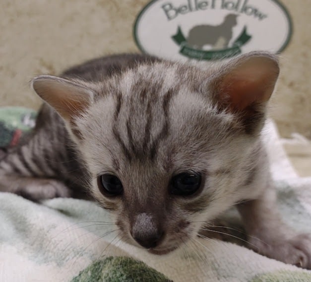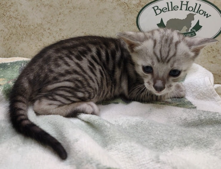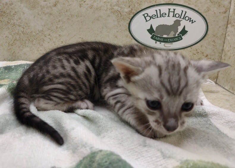 Savannah F-4SBT Silver Male DOB 4-10-23Just beautiful this little F-4SBT Silver Savannah Boy will be a stunning adult and loving companion. He will be going home to Chris and Danielle, their children and Aengus another Belle Hollow baby in North Carolina. [Show slideshow]