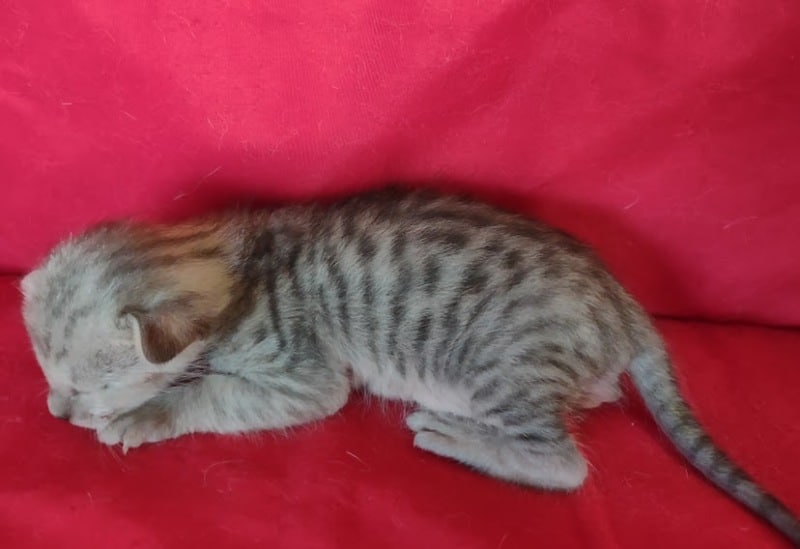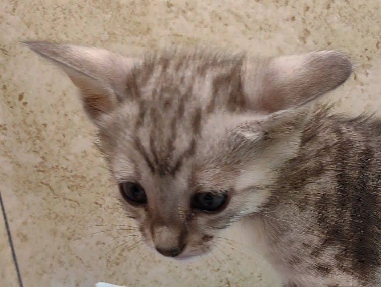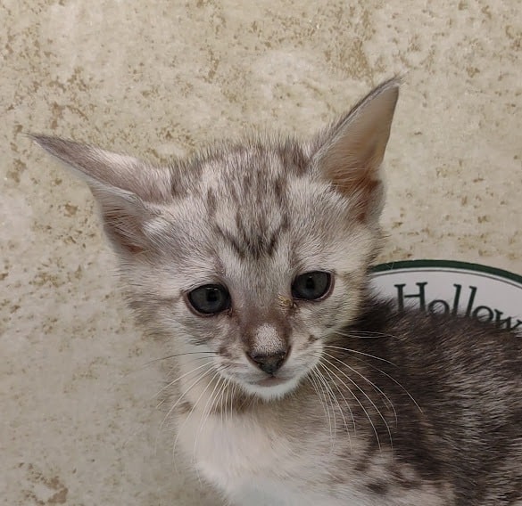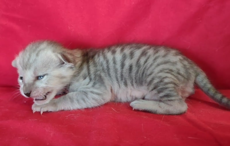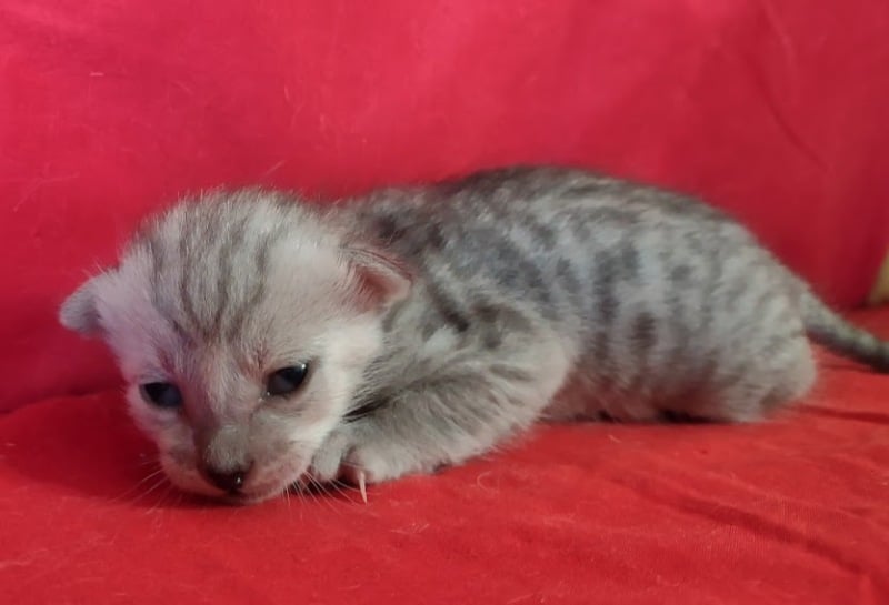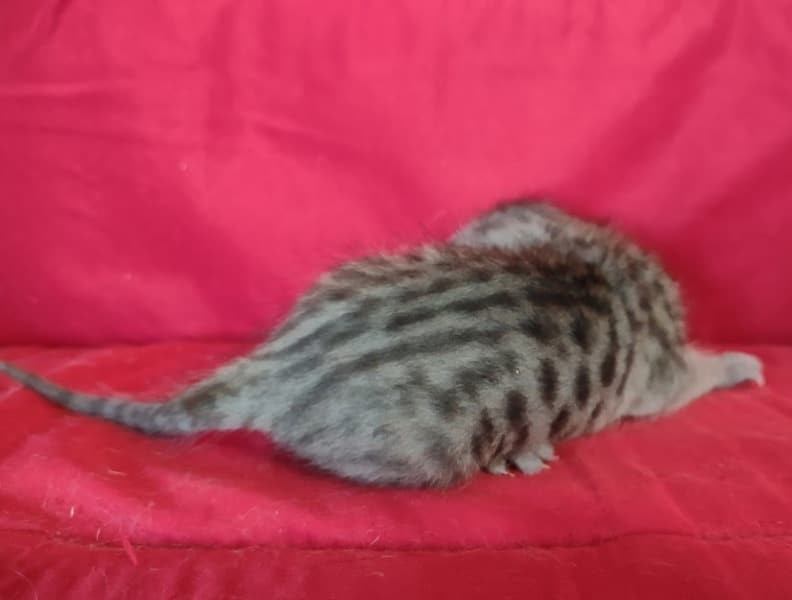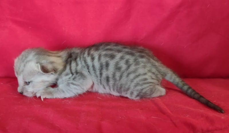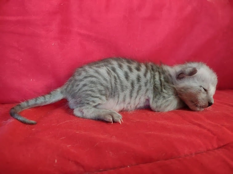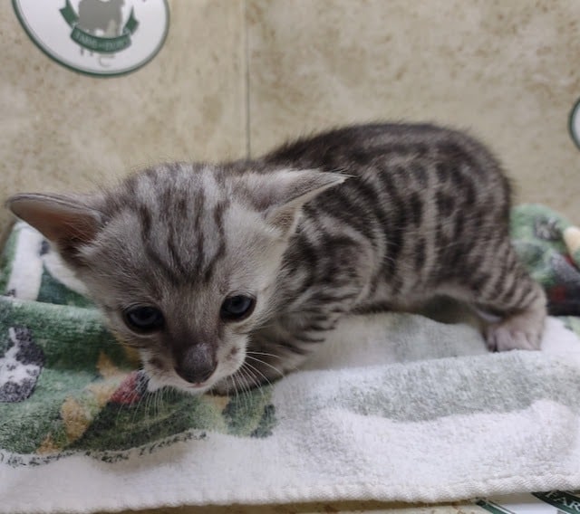 Savannah F-4SBT Silver Male DOB 4-10-23Just beautiful this little F-4SBT Silver Savannah Boy will be a stunning adult and loving companion. He will be going home to Chris and Danielle, their children and Aengus another Belle Hollow baby in North Carolina. [Show slideshow]
