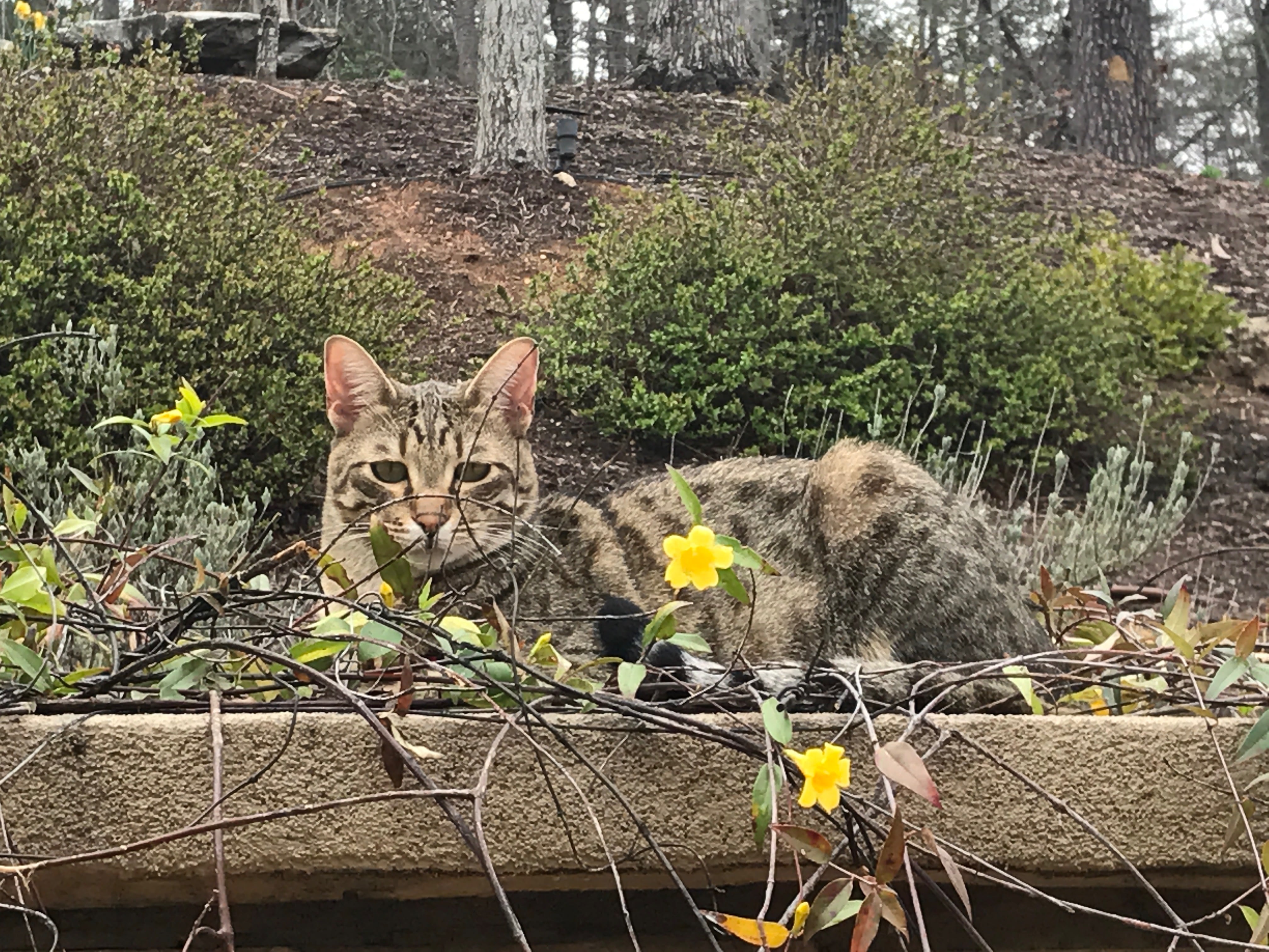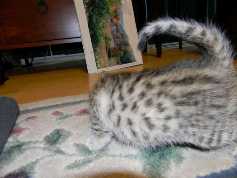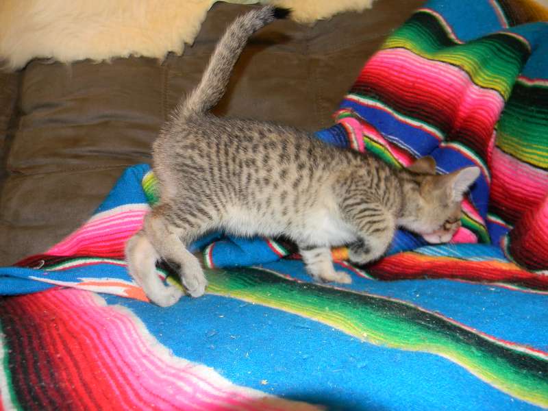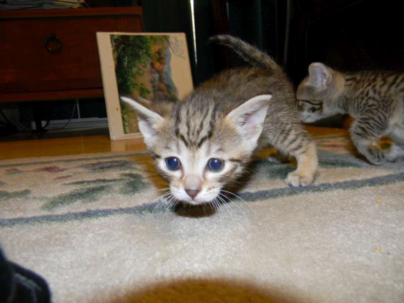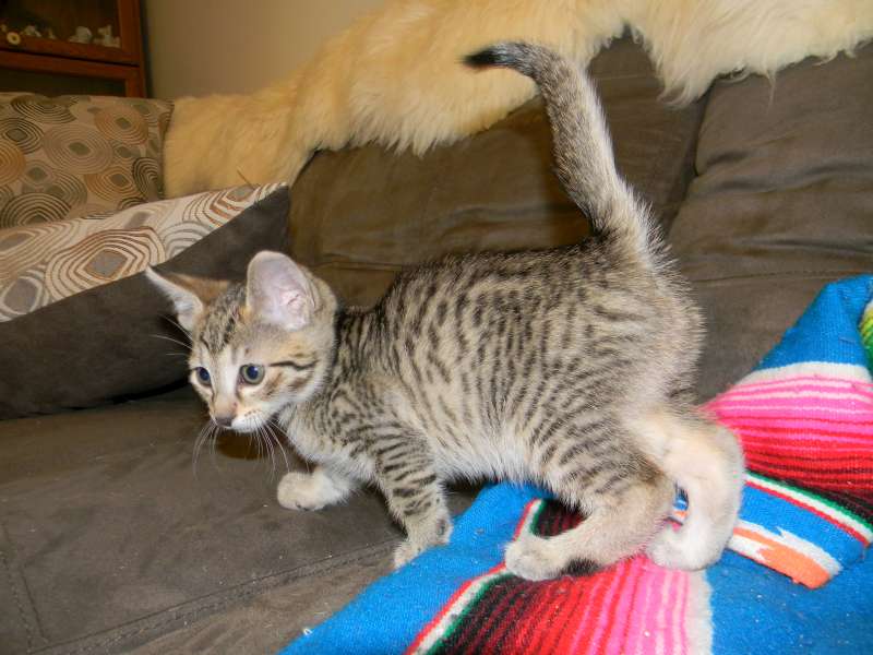 Good afternoon, Betsy. I noted your posting on Facebook of the two Savannah siblings. We think our cat Addie might be their littermate. She was born on Oct. 2nd, 2014. Her parents were Tang and Screamer. Here is a picture that you can post if you want. Although her harness doesn't show, rest assured that she is on a leash. We take her out everyday for several hours. She stays right with us as we do yard work. We also take her with us on road trips. Just completed one from our home in South Carolina to Chicago. She either sits on her bed on the center counsel of the car or in my lap. Addie has been a perfect cat...super playful, protective of us and is always by our side. We love her dearly. You may recall, that she almost starved to death when we first got her. She stopped eating and got down to 2.5 lbs before recovering. How lucky we are to have her!