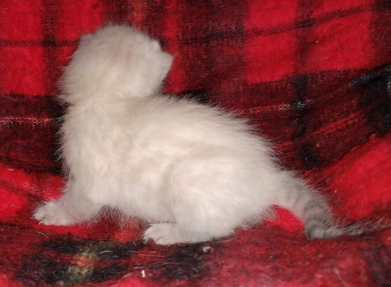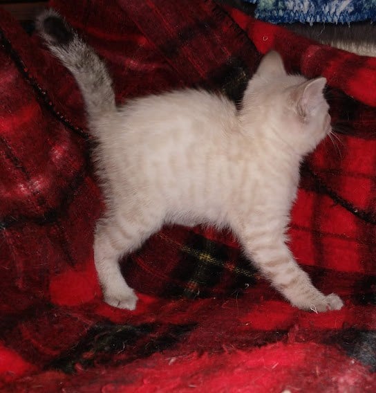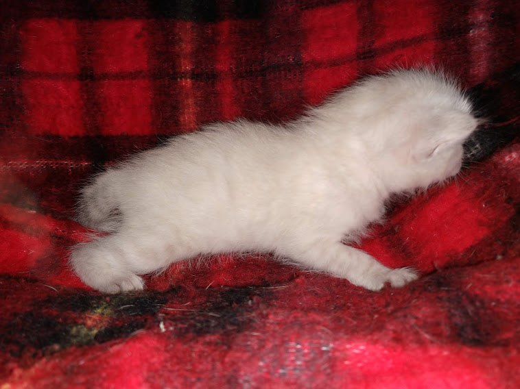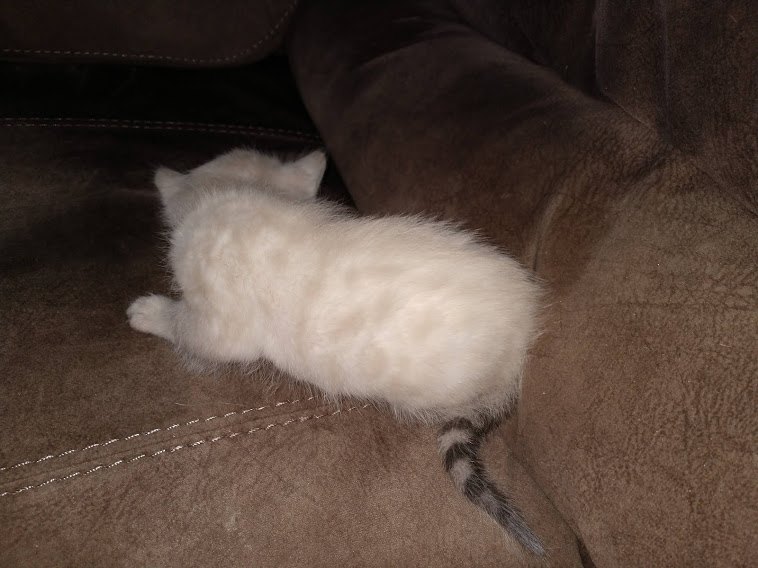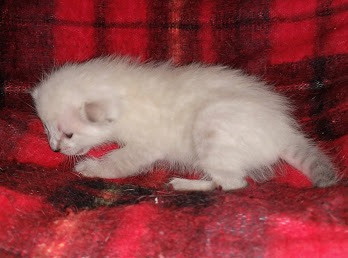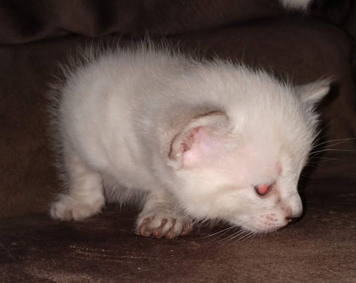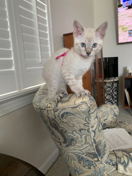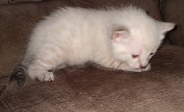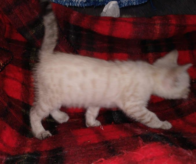 This sweet snow savannah girl will be a beauty. Born white, snows get their color as they grow begining with their tails and ears. If you look closely you can see the beginning of her spots. As an adult she will have Lynx point markings, pretty grey to brown spots and beautiful blue eyes. She will be going home to David and Cheryl in VA.