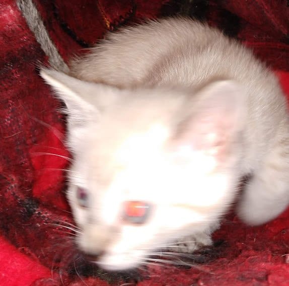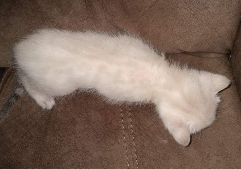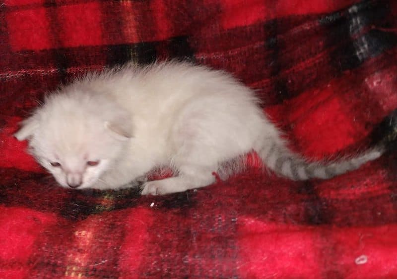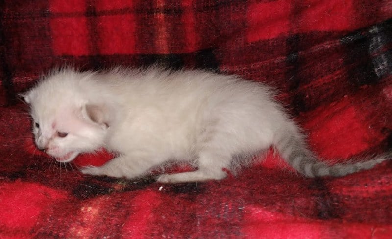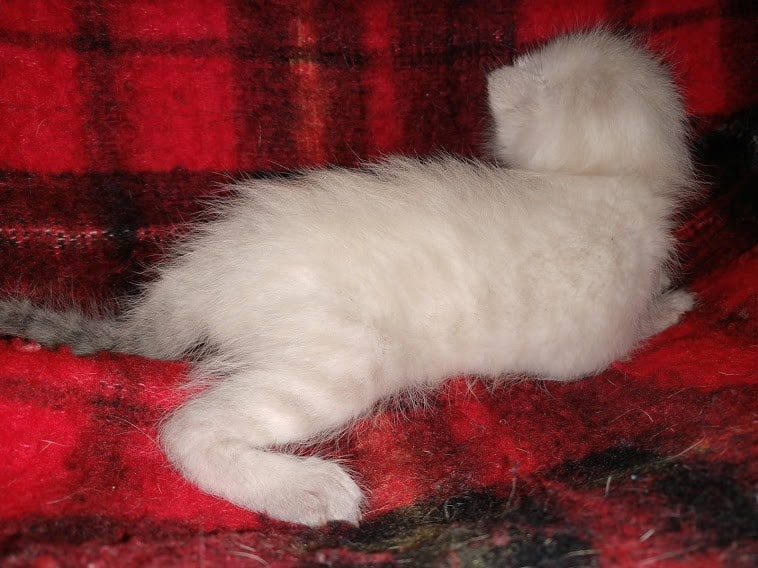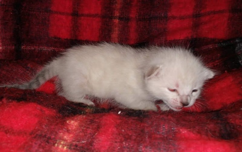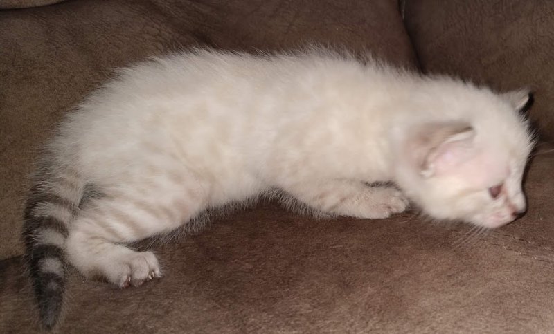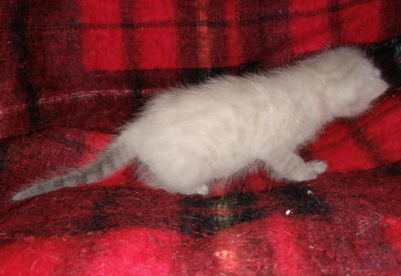 This sweet snow savannah girl will be a beauty. Born white, snows get their color as they grow begining with their tails and ears. If you look closely you can see the beginning of her spots. As an adult she will have Lynx point markings, pretty grey to brown spots and beautiful blue eyes. She will be going home to David and Cheryl in VA.