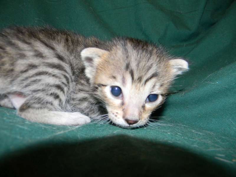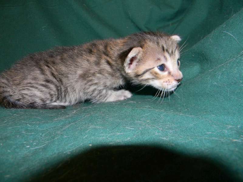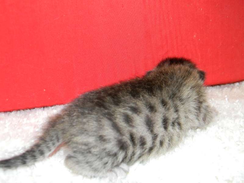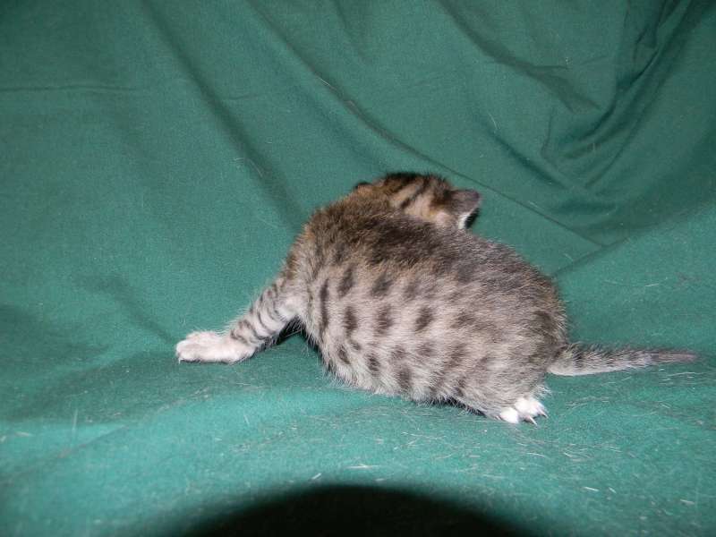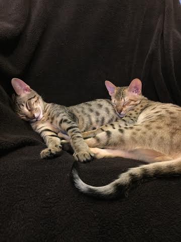 This beautiful Brown Spotted Savannah girl has large spots. She is from Truffles F-5SBT and Triumph F-7C slightly dark but still warm in color. She and her golden spotted brother are going home to Natalie and John in MO