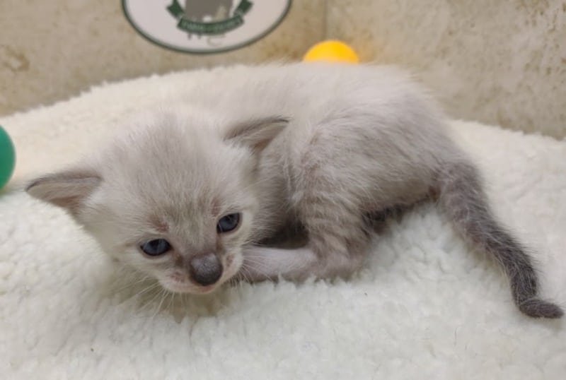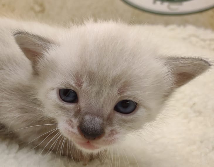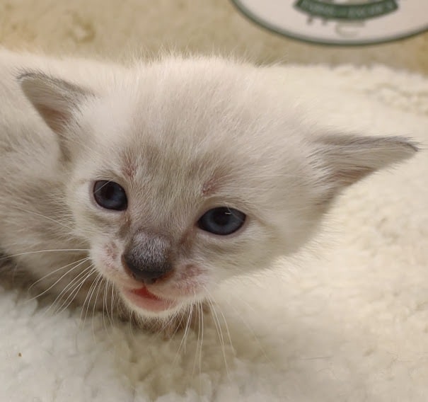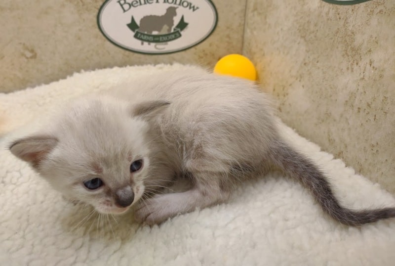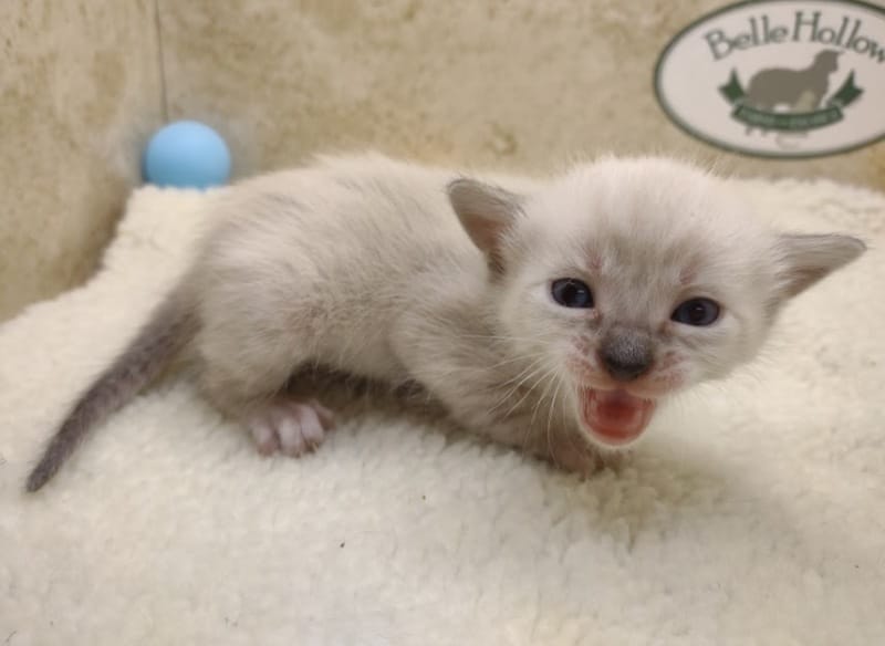 Snow kitten are born white like Siamese and develop color points and spots as they grow. This girl is just getting her color points and her ears and tail. Her spots can barely be seen so far. She will be going home to Charles and family in OH where she will join a whole family of Belle Hollow kittens