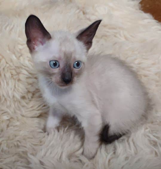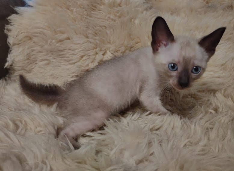 This pretty snow savannah girl has darker marking than her sister at this time. Since her color will change over time it is impossible to know how her marking will finally end up. She will however have blue eyes and lynx points and lots of spots. She will be going home to Eric in NC.
