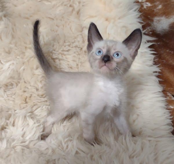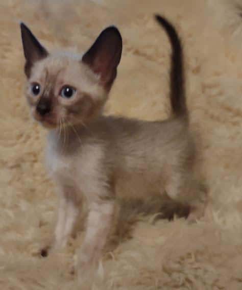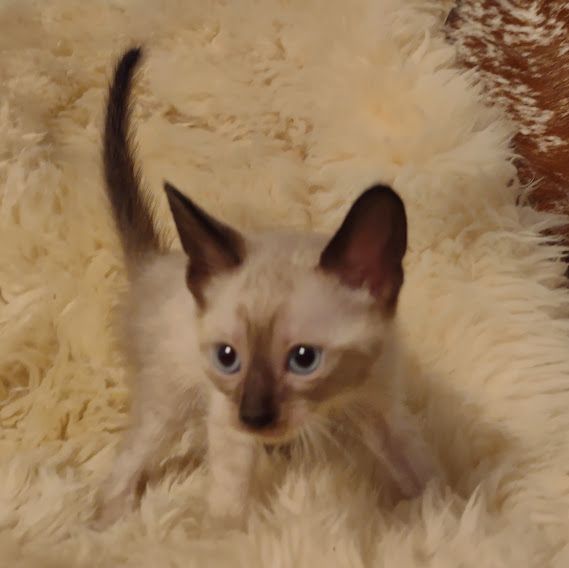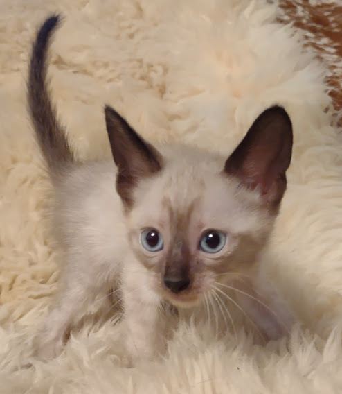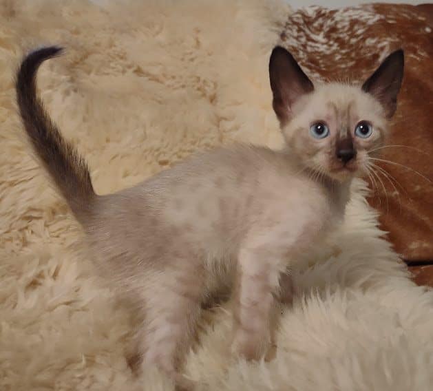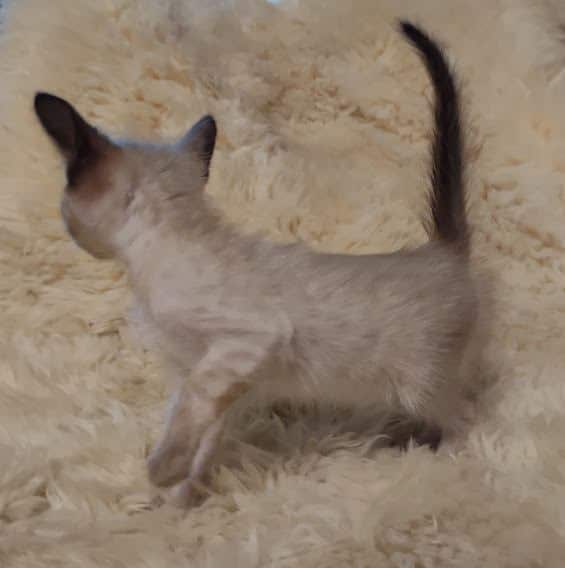 Another beautiful snow savannah boy. This guy has a creamy shade to his white coat and may end up being a seal point with spots. Snow kittens are so beautiful. You can see the color coming on his ears and tail plus the shadow of his upcoming spots. He will be going home to Jennifer and Ian in MI.