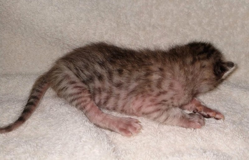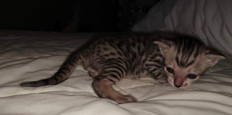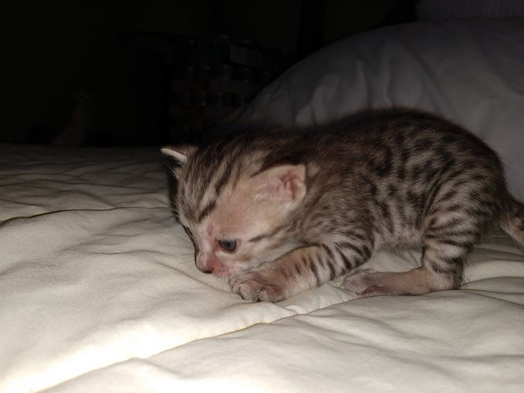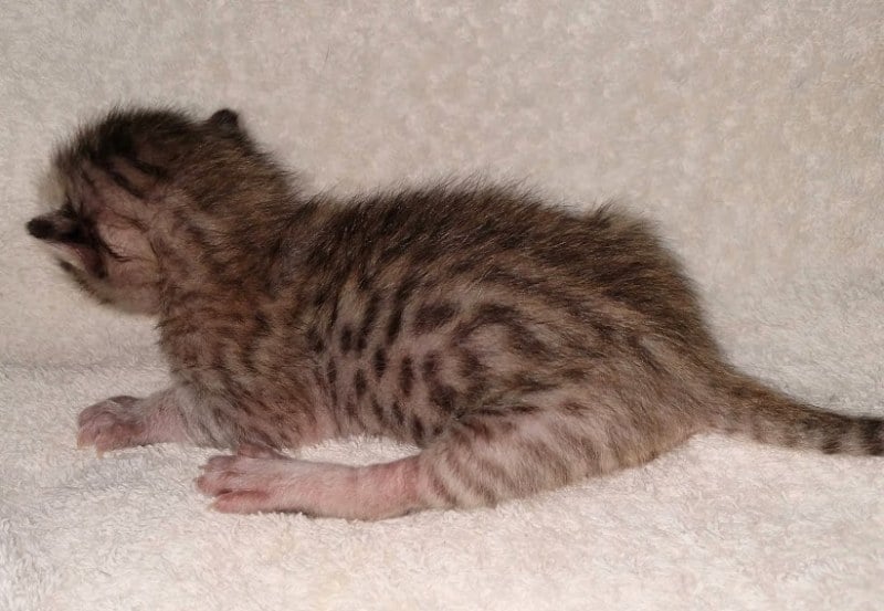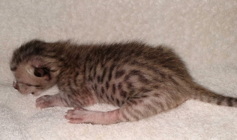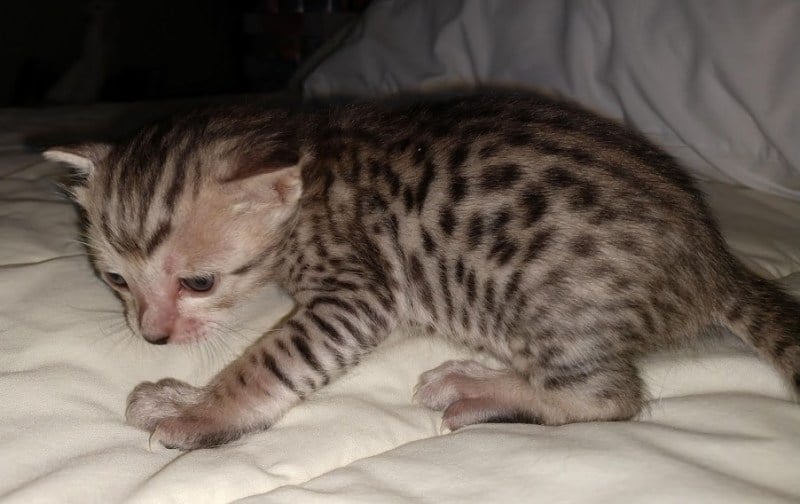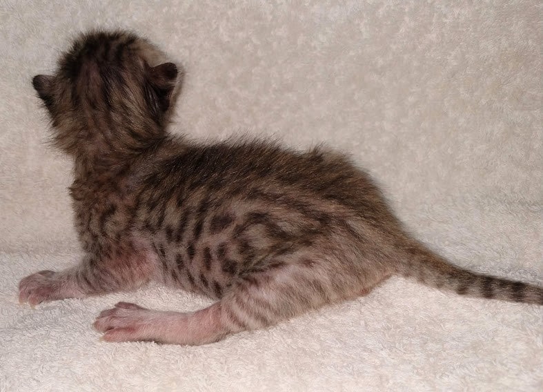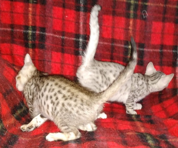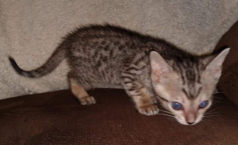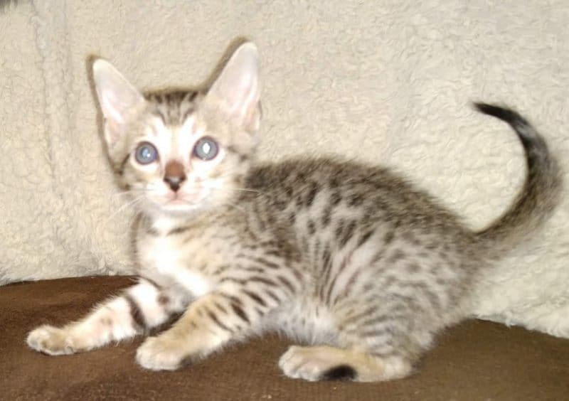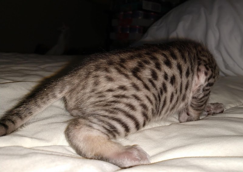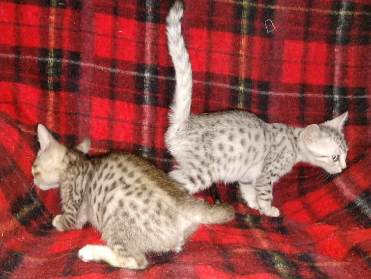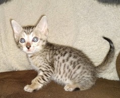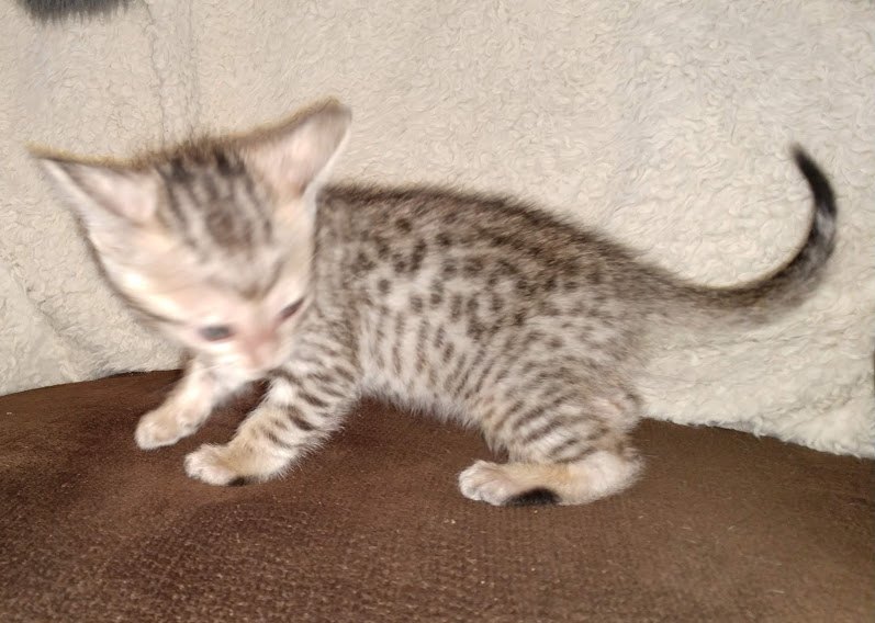 Pale in color not unlike a silver this SBT savannah boy has very distinct spots and will be a wonderfully exotic looking adult. He will be joining another Belle Hollow Egyptian Mau kitten as pets for Mariana and Mathias.