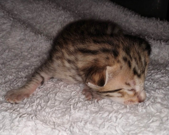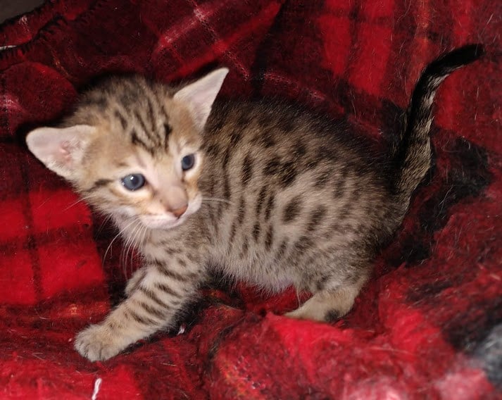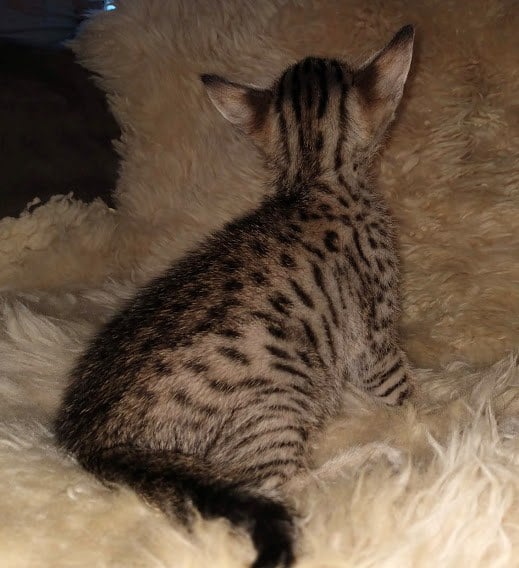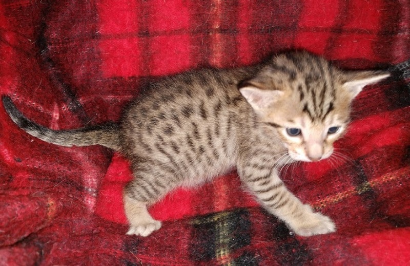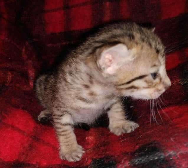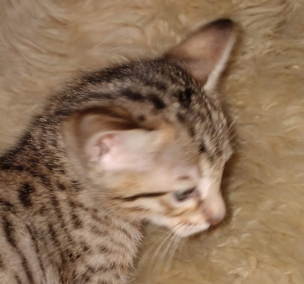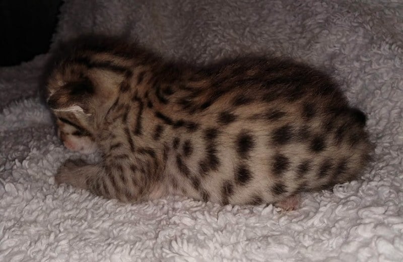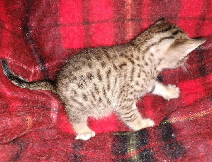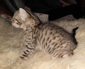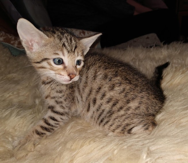 Savvy Savannah F-7SBT Male #1 DOB 3-11-21This precious F-7SBT savannah boy will be a beautiful adult and loving companion for Charles in VA. Slightly darker gold than his brother he will be stunning. [Show slideshow]