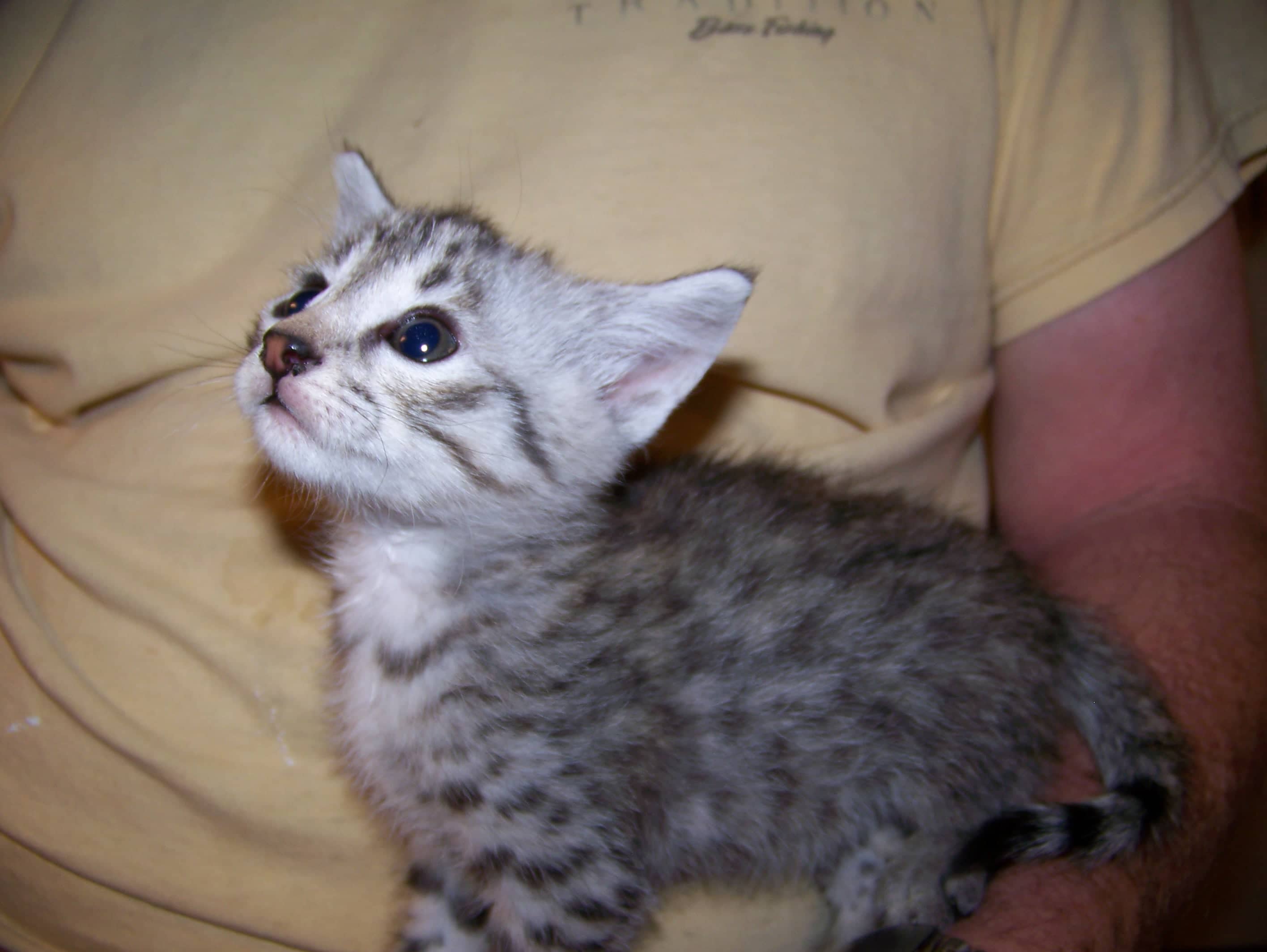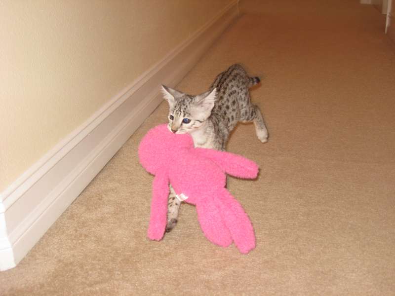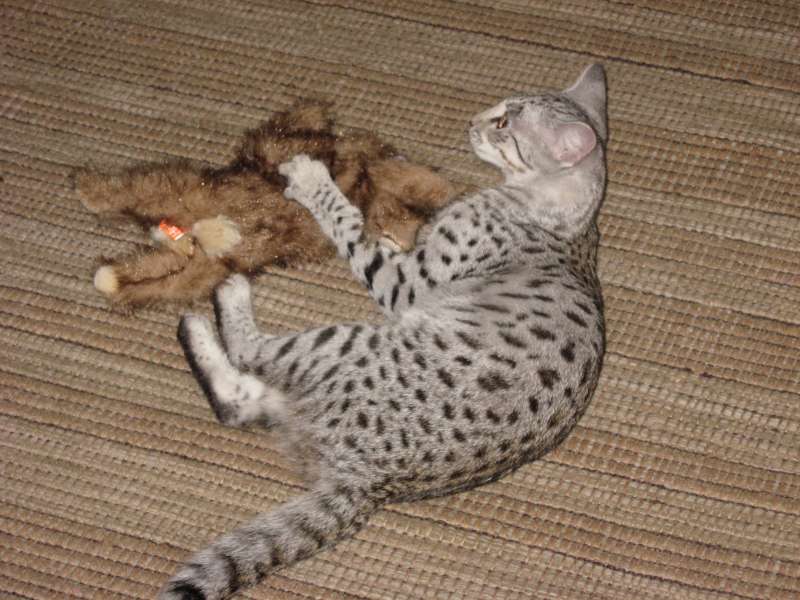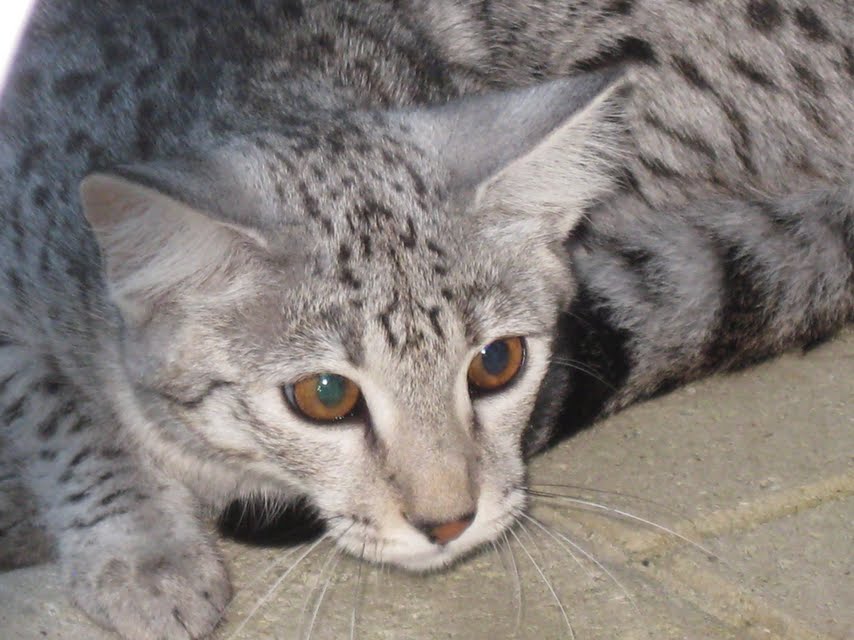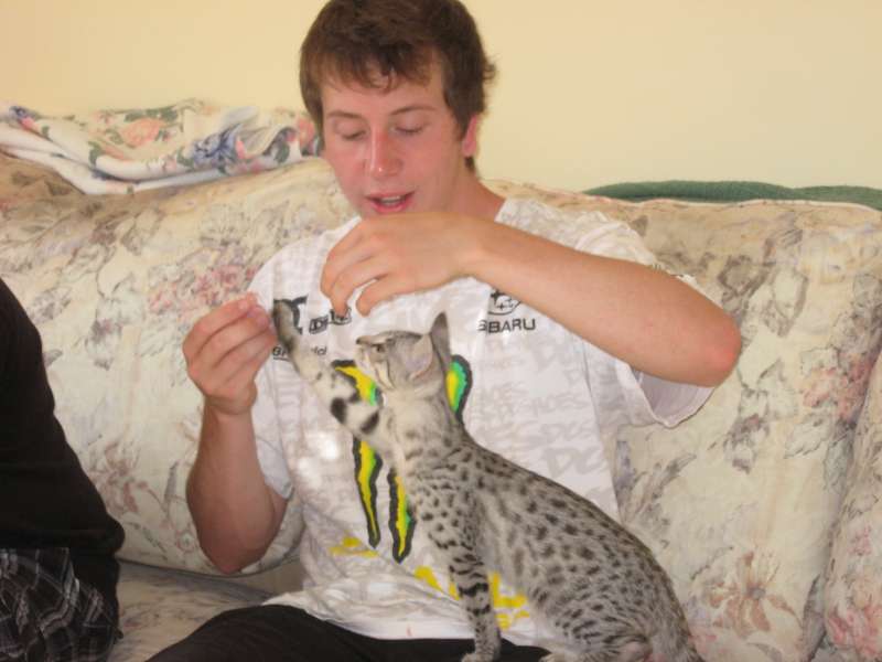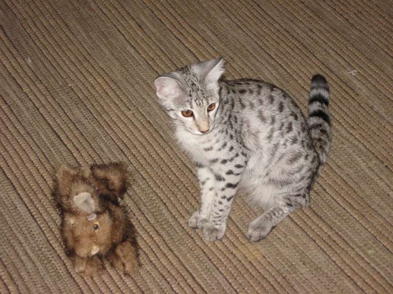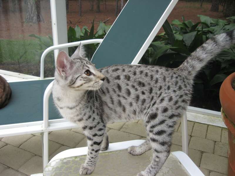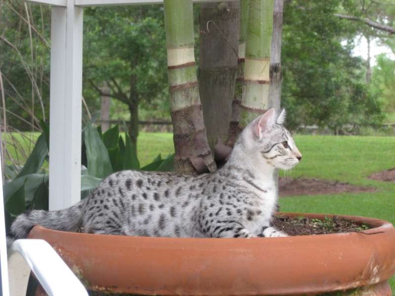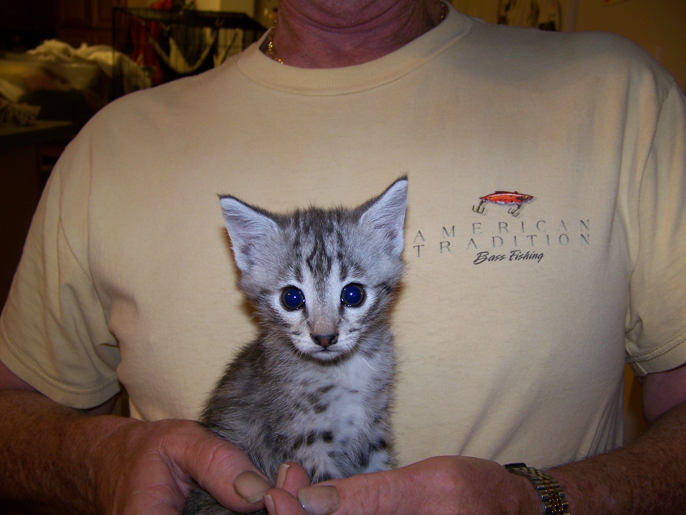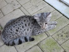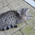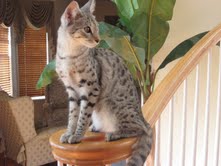 With her angelic face Sheikra ( formerly Nipper) an F-2 Savannah female black/brown spotted tabby will have golden highlights in her cool colored coat and a great black spot pattern She has gone to live with Susan and her family in Florida.