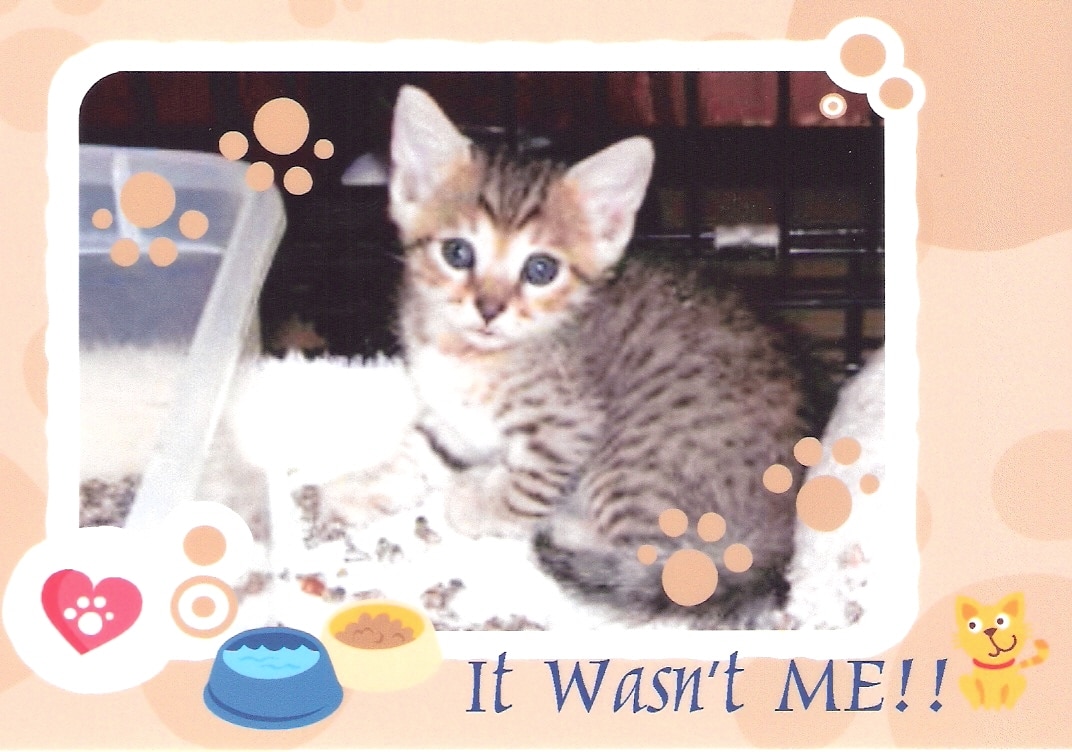 So-Co – Egyptian Mau Male DOB 3-27-10So Co Bronze Male Egyptian Mau is going to live with Julie and her Mom Louisiana. Bronze Egyptian Mau Male So Co is under contract to Julie in Lousianna Meet So Co Bronze Egyptian Mau Male. He went under contract at 1 day of age and can't wait to move south with his Mom Julie. So-Co is SOOOO Cute. Bronze Egyptian Mau Male under contract to Julie and her Mom. So Co - a bronze Egyptian Mau male is jst starting to get his legs and personality! Shown here at about 3 weeks. So-Co a Bronze Egyptian Mau shown here at about 7 weeks is just to cute and full of himself. So Co -Caught in the act after just dumping the litter pan into his food bowl and bed! SoCo - Bronze Egyptain Mau will go home with Julie next week! [Show slideshow]