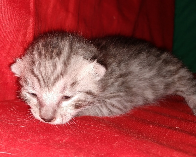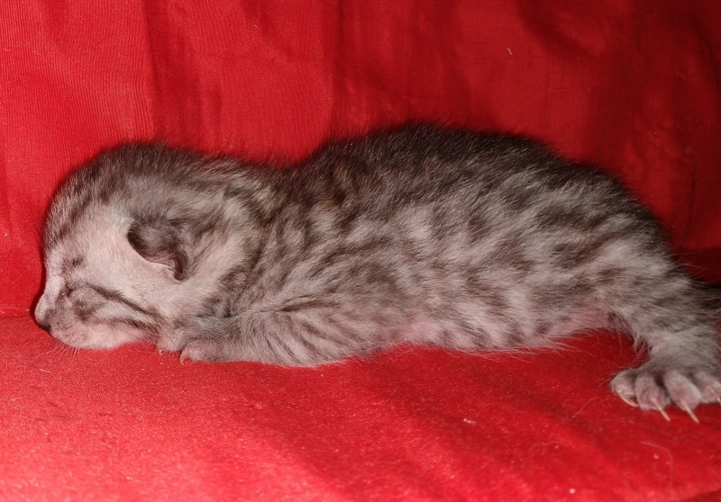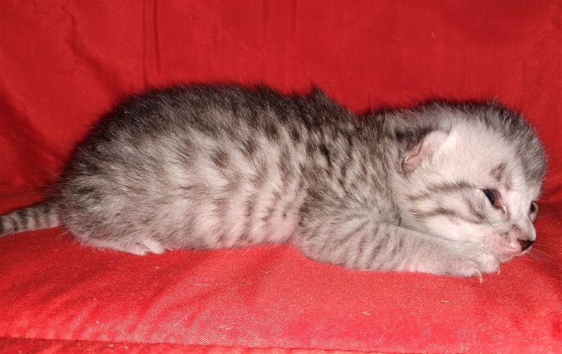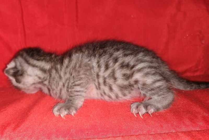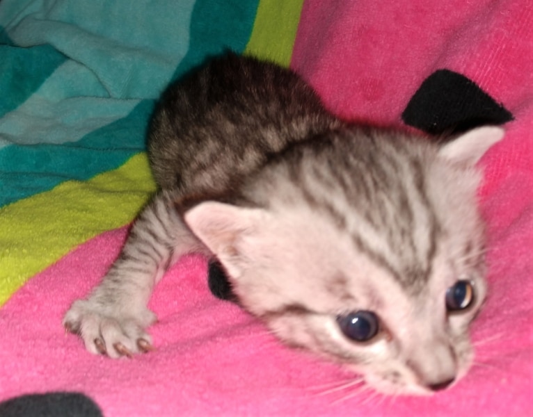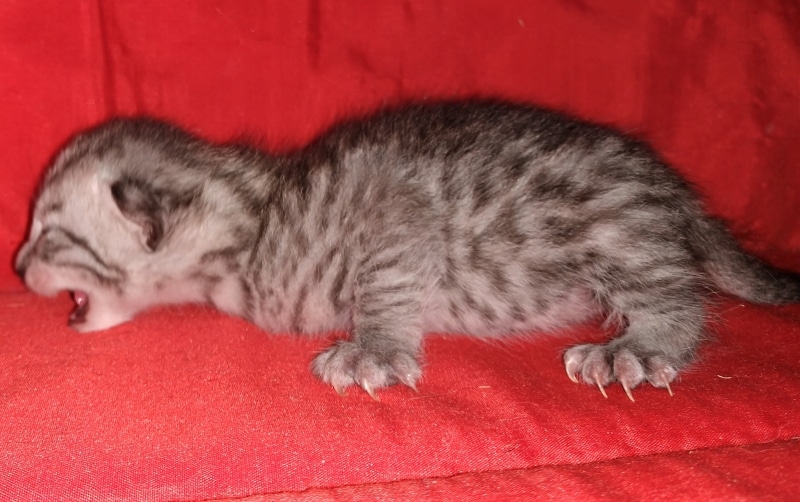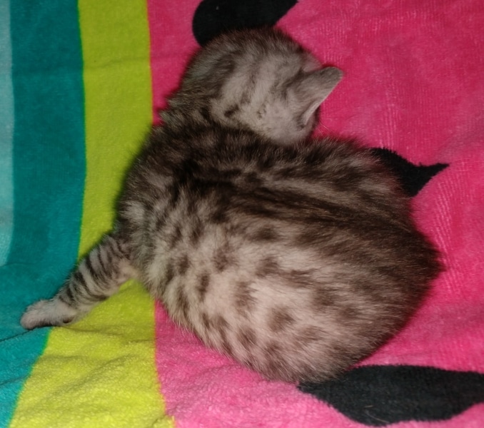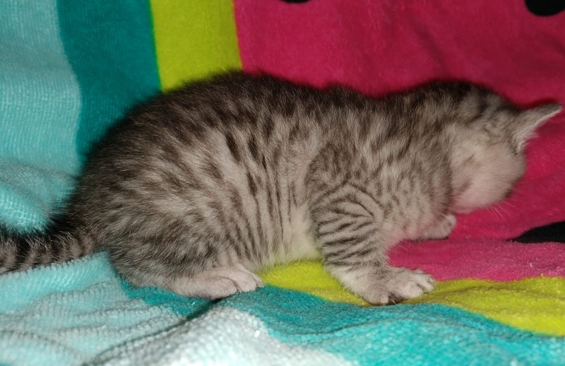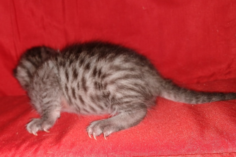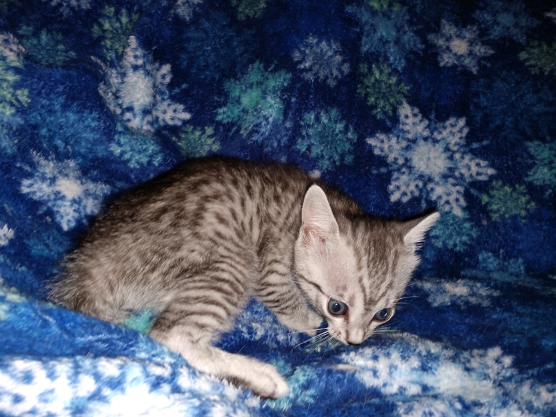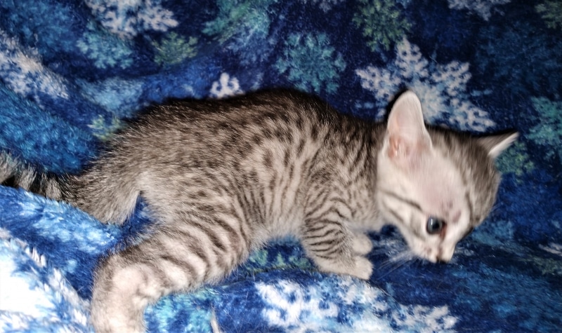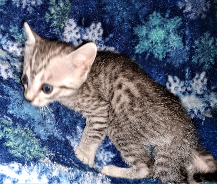 Stitch Egyptian Mau silver male DOB 3-3-20This sweet silver egyptian mau boy has a dark top line from head to tail at the time. He has great spots and will be a beautiful and loving companion for Sarah, Isaac and their new savannah kitten, also from Belle hollow, Lilo [Show slideshow]