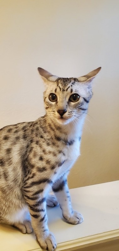 Twinkle is now 2 years old and after a short lack luster career as a queen we have decided to retire her. She is a kitten at heart, loves everyone and will make a super pet for Brooke in SC who already has another of our Mau kittens Luna.