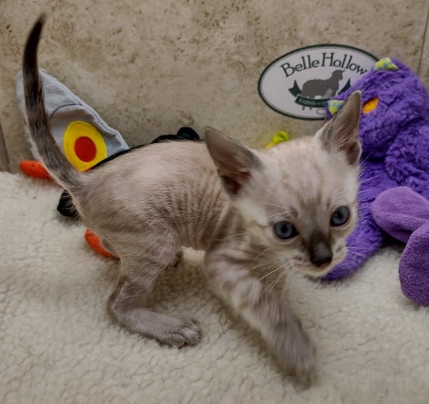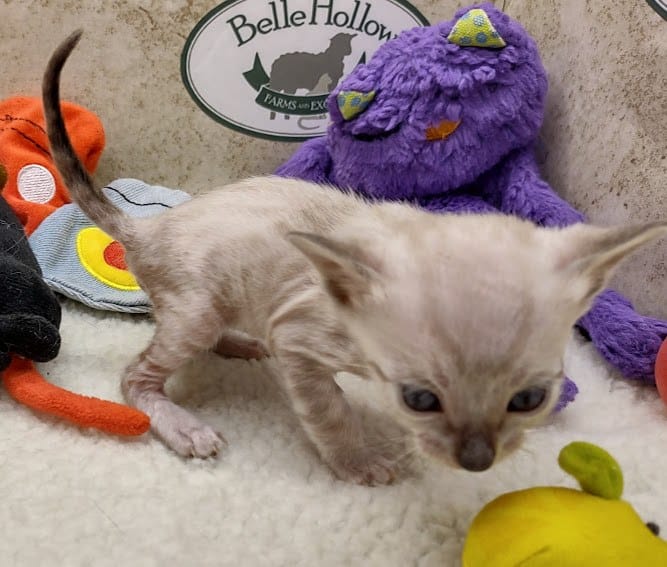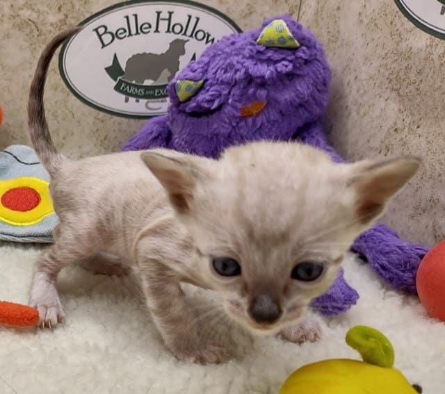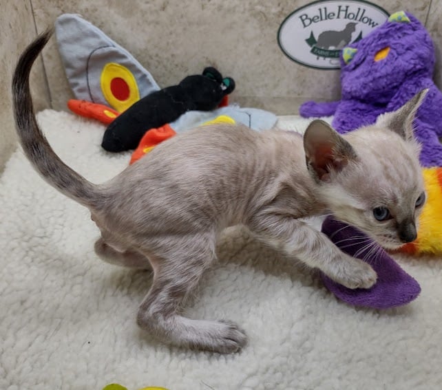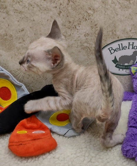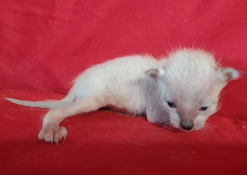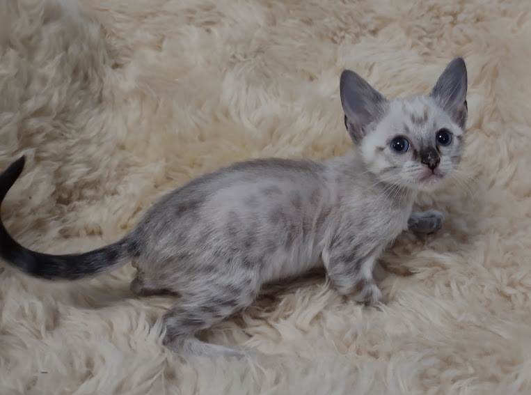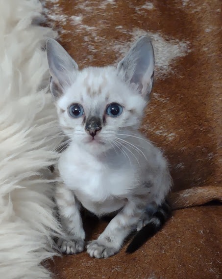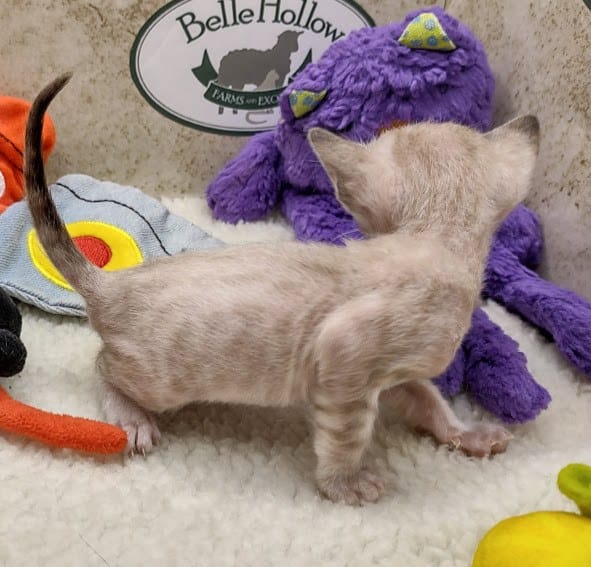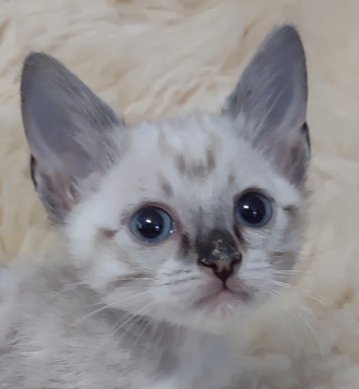This sweet little F-6SBT snow savannah boy is the tiniest of his litter. In that there are 9 he is doing great but he has some catching up to do. You can see the spots coming in his coat and the dark points well under way. I suspect he will out grow several of his siblings but has to catch up from behind. He and his Brown Spotted Sister Freya have gone home with Saben and his other two brother cats in NC