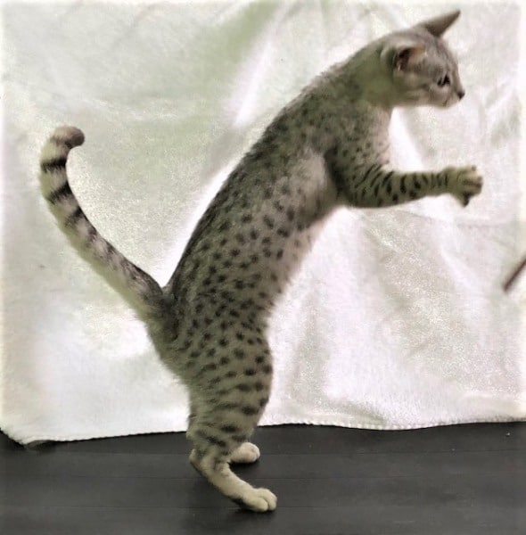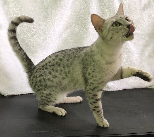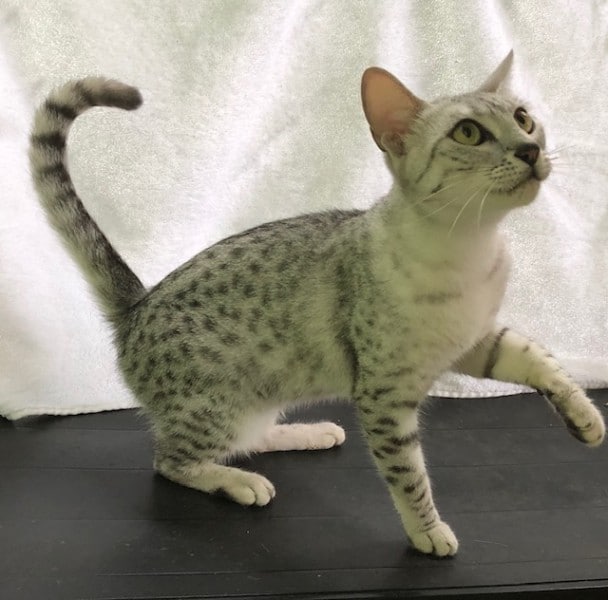 Wildtrax Winter of Bellehollow Egyptian Mau SilverWinter is a new queen we brought in from Wildtrax in our efforts to diversify our bloodlines. We hope for great kittens from her. [Show slideshow]